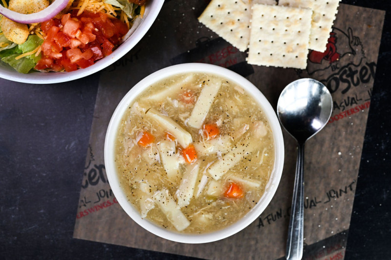 - The Red Rooster Salad: Mixed lettuce, egg, bacon bits, cucumbers, red onions and tomatoes.
